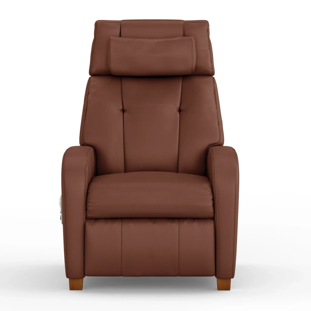 Contemporary elegance meets superior comfort and functionality in the Café+ True Zero Gravity® massaging power recliner. Masterfully hand-stitched top grain leather and body-conforming memory foam cradle you in rich, relaxing repose. The sturdy steel frame is built to last a lifetime. Two independent encoded actuators – one for the back and one for your legs and feet – smoothly move you from upright to deep recline, and reliably take you to preset positions or your favorite saved positions. Soothing heat and the sequenced Deep-Relax Waveform Massage carry your body and mind to a place of quietude and peace.